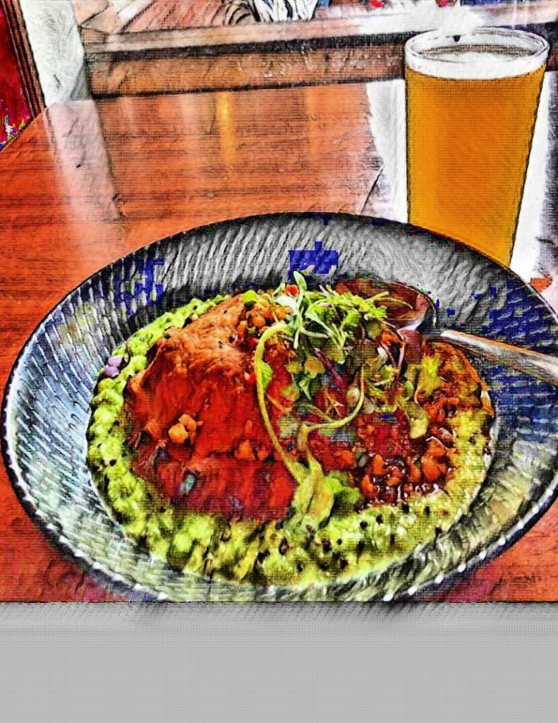 They took a table and the young man told her that they only needed to have one meal – the Pie Floater. When it arrived Mizu saw that it was an upside down meat pie served in a bowl of split pea soup. The pastry was crisp and flaky within which lay flavoured soft meat. The pea soup beneath the pie was silky rich and earthy.