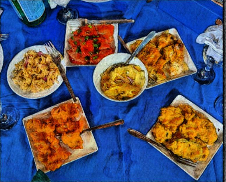 In around 20 minutes, a waitress arrived with a platter of grilled red snapper, aubergine fritters, parrot fish, chicken curry, tuna steak, fish stew with vegetable, rice and mango salad.